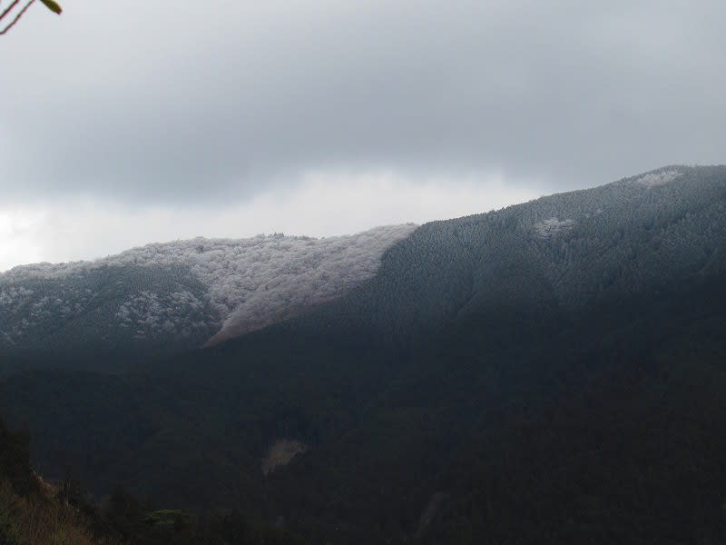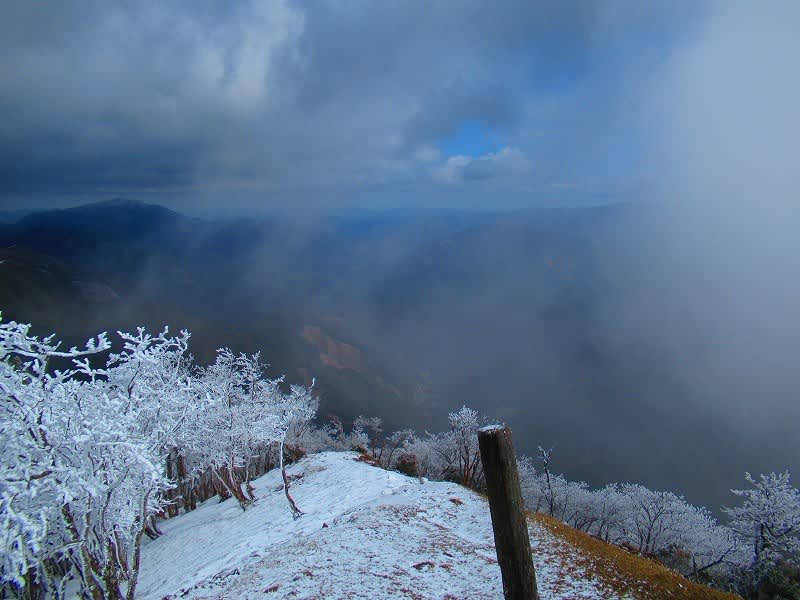黒く大きく垂れ下がった雪雲の下の隙間から かすかに覗いている白い山は 大高山脈縦走路の