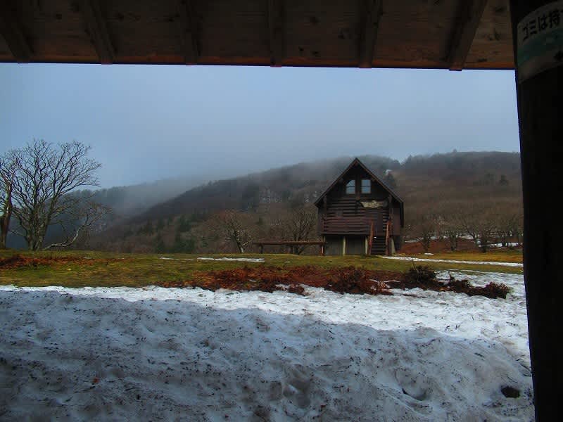 避難小屋の中は風もなく ホッとします。ここでお昼ご飯を食べます。