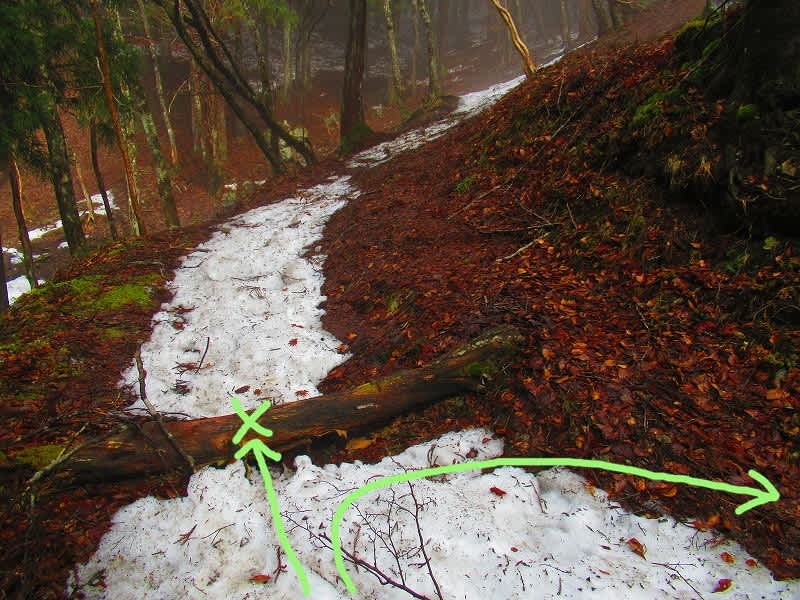 右の道は雪がないので、雪の上をそのまままっすぐ歩いてしまいました。