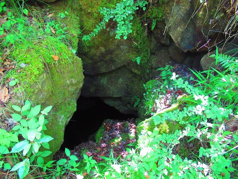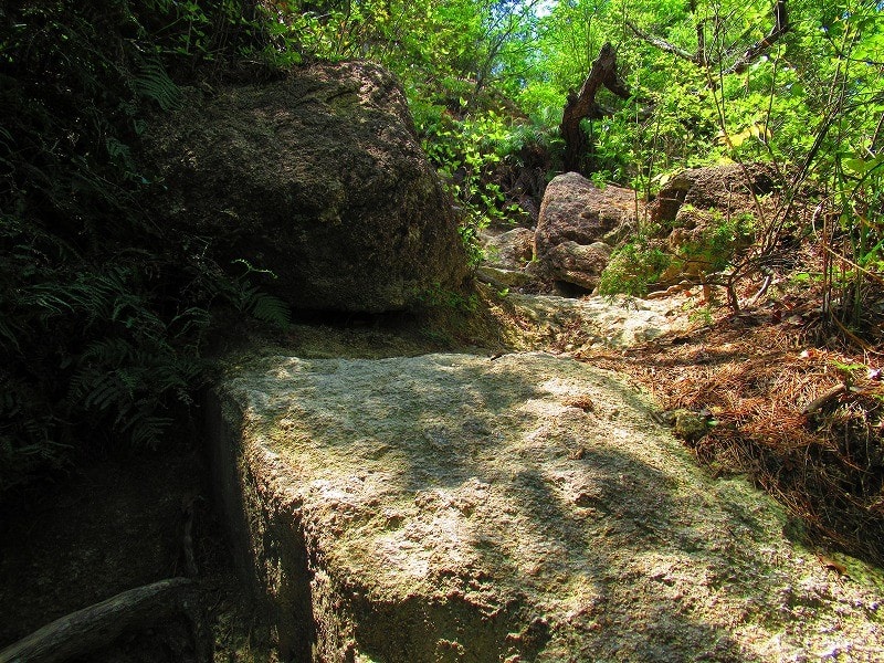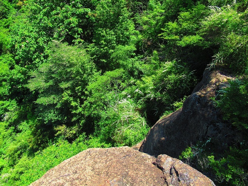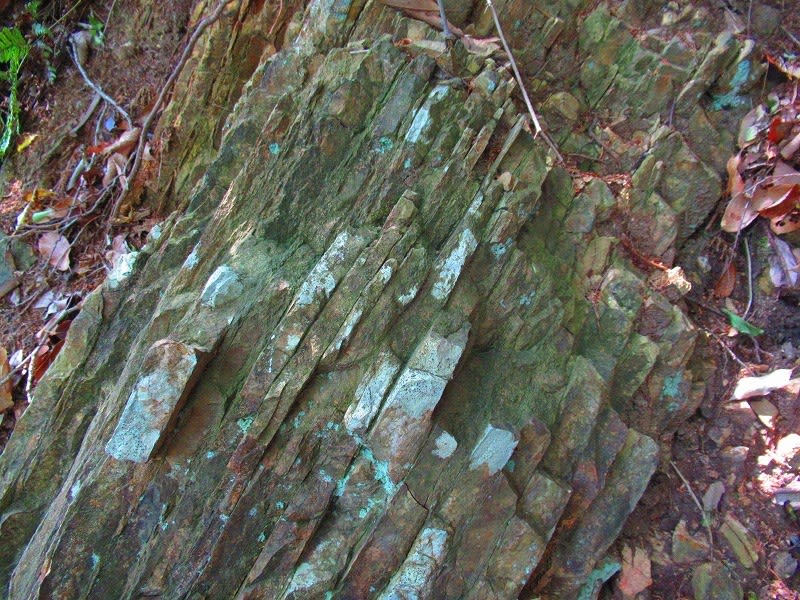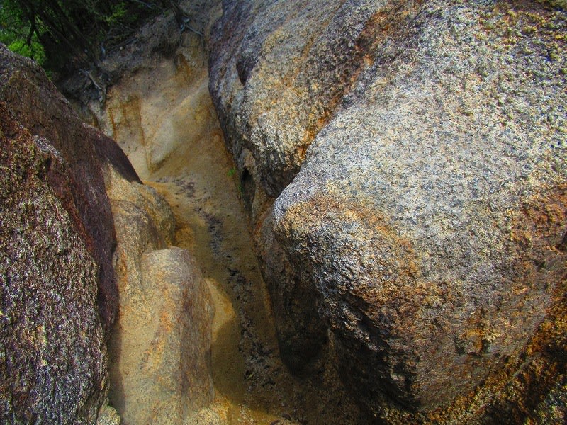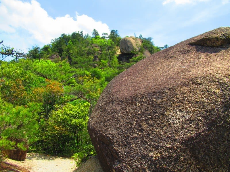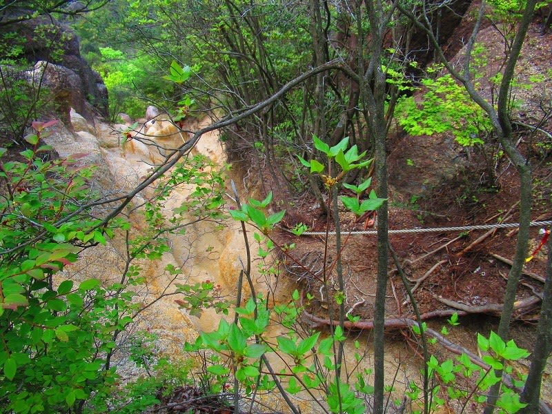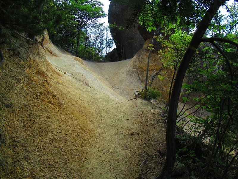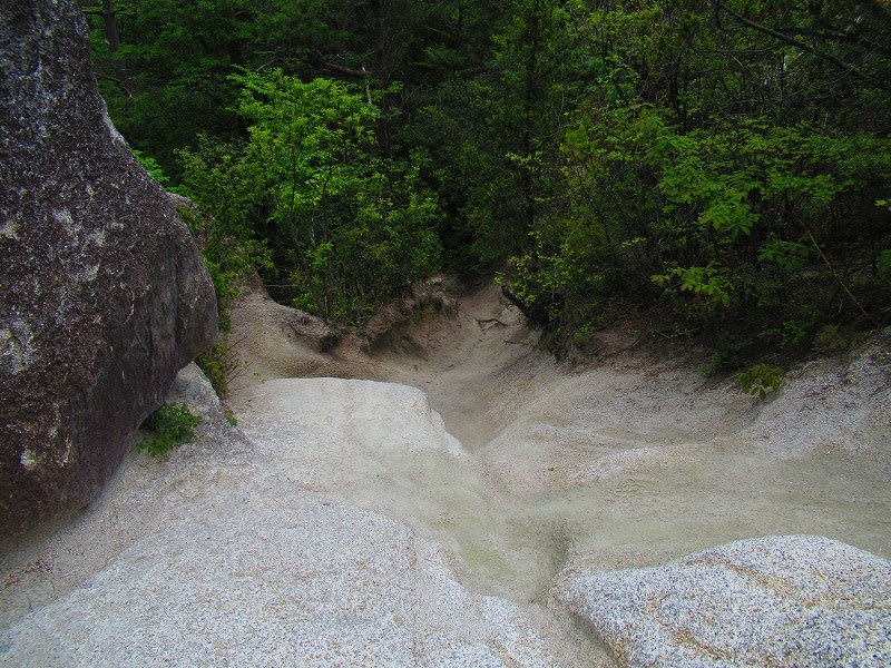 川の中ではこんな岩をよく見かけますが ここは山の上です。雨だけでもこんなに削られるのですね。