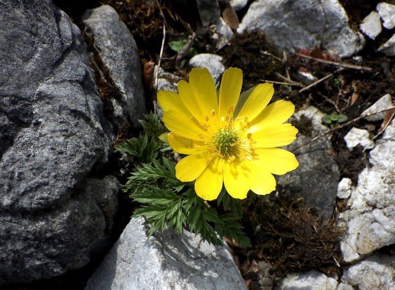 福寿草は カルスト台地の岩陰に 一面に咲いていました。あまりたくさん咲いていたので