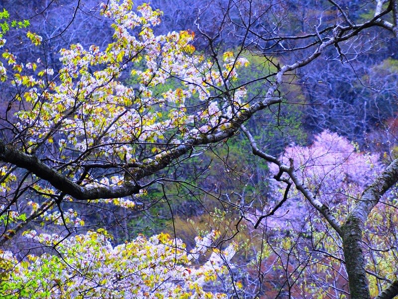 目の前に花びらが 舞い落ちてくるので 見上げると 満開の山桜があちこちに咲いています。