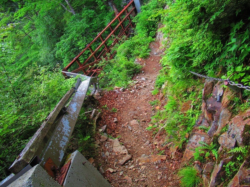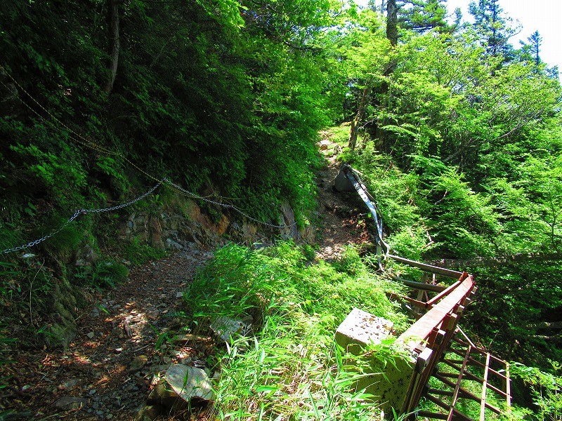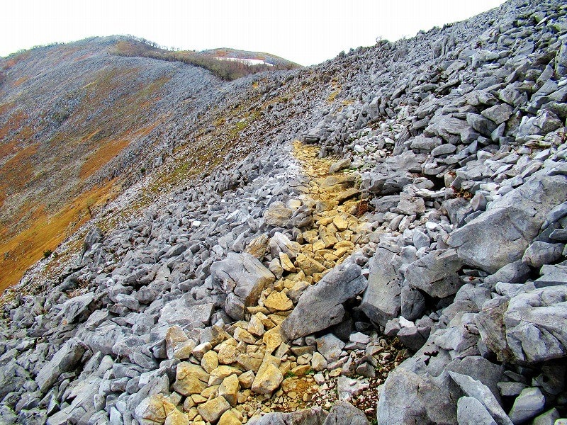 やがて見覚えのある ガレ場の急斜面が見えてきました。ここから急降下が始まります。
