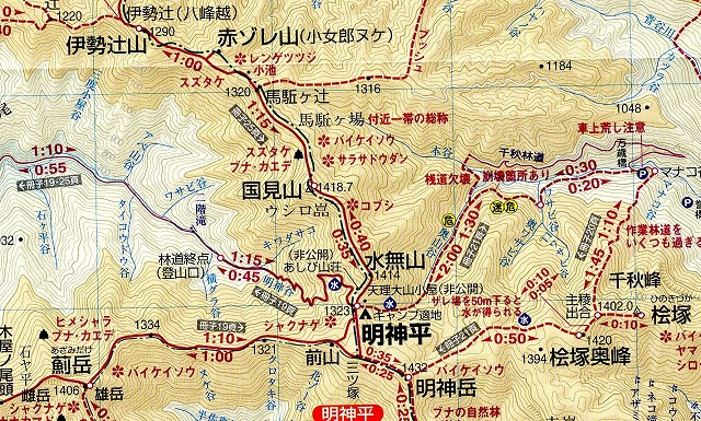 私が記入したピンクラインが 帰路の高見峠からスタート地点までの予定コースでしたが