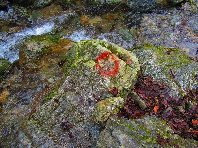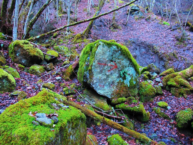 かなり下まで降りて よく探したらちゃんと指示の矢印がありました。やはりもう一つ右の谷へ