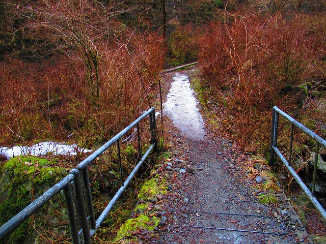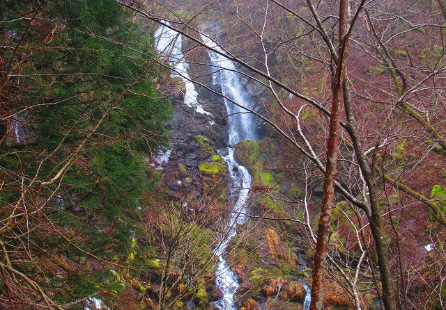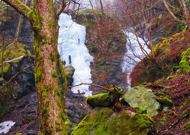 スパイクを付けて暫く歩くと 前方に滝が見えてきました。明神の滝です。そして登ってきた