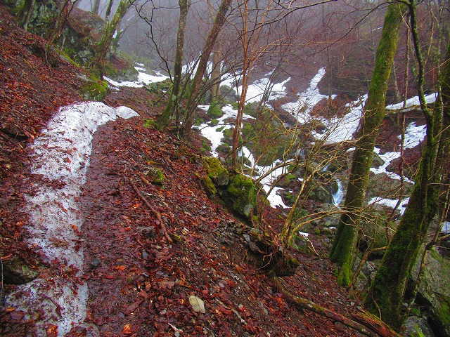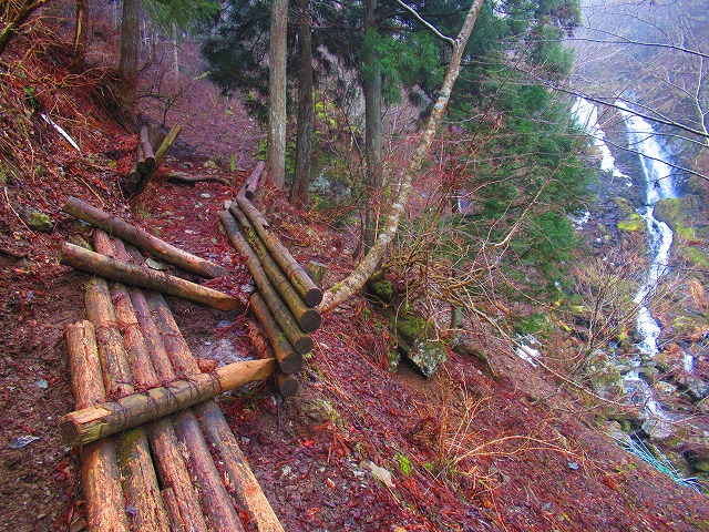 明神の滝を見ながら登ります。以前はここは こんなに崩れていなかったけどなあ。