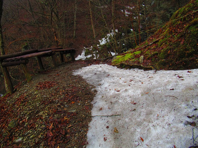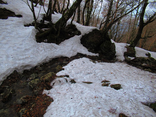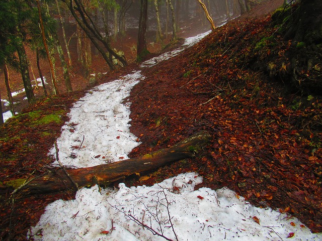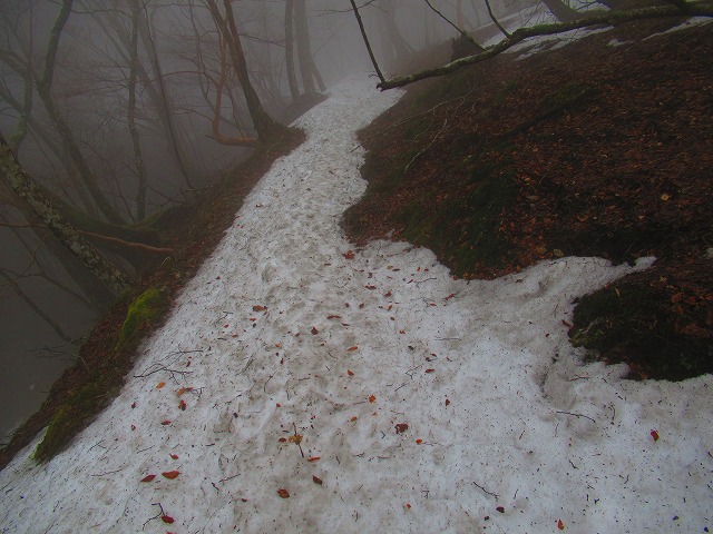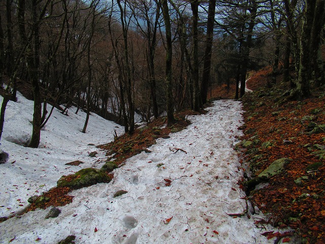 暫く登ると残雪が現れました。氷になっています。固くツルツルです。
