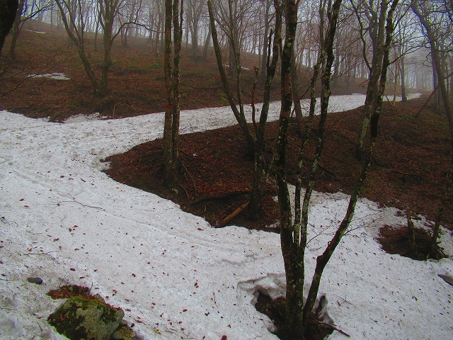 雪が半分腐っているので この辺りはズボズボ足がめり込みます。