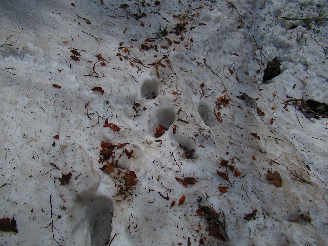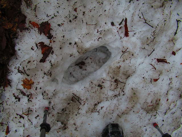 やがてところどころに 残雪が現れました。固く凍っていてツルツルです。